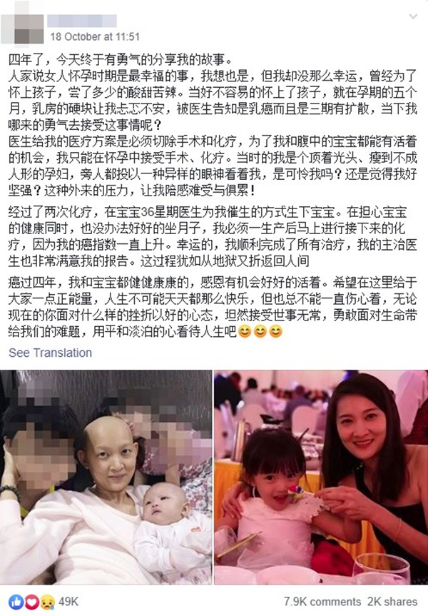 "Trong 4 năm, cuối cùng tôi cũng có can đảm để chia sẻ câu chuyện của mình ngày hôm này. Mọi người nói rằng, với phụ nữ, mang thai là điều hạnh phúc nhất, nhưng tôi không nghĩ vậy. Tôi không may mắn lắm. Tôi đã nếm bao cay đắng mới có thể thụ thai. Nhưng khi đang mang thai ở tháng thứ 5, các khối u trên ngực khiến tôi không yên tâm. Bác sĩ nói với tôi rằng đó là ung thư vú và nó đã chuyển sang giai đoạn 3. Tôi lấy đâu ra can đảm để chấp nhận điều này".