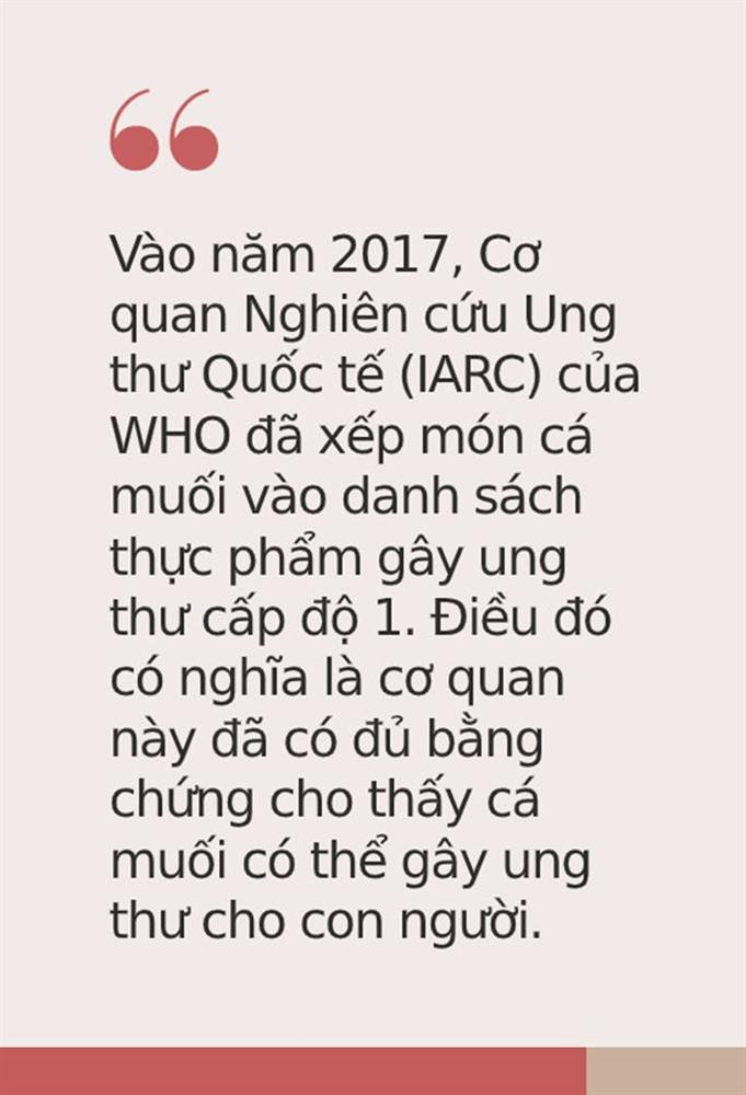 Vào năm 2017, Cơ quan Nghiên cứu Ung thư Quốc tế (IARC) của WHO đã xếp món cá muối vào danh sách thực phẩm gây ung thư cấp độ 1. Điều đó có nghĩa là cơ quan này đã có đủ bằng chứng cho thấy cá muối có thể gây ung thư cho con người.