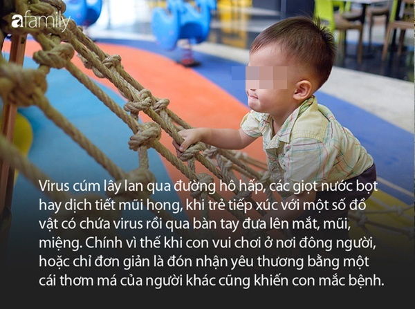 Virus cúm lây lan từ người sang người qua đường hô hấp, các giọt nước bọt hay dịch tiết mũi họng khi người bệnh ho, hắt hơi, hoặc lây qua tiếp xúc với một số đồ vật có chứa virus rồi qua bàn tay đưa lên mắt, mũi, miệng. Chính vì thế khi con vui chơi ở nơi đông người, hoặc chỉ đơn giản là đón nhận yêu thương bằng một cái thơm má của người khác cũng khiến con mắc bệnh.