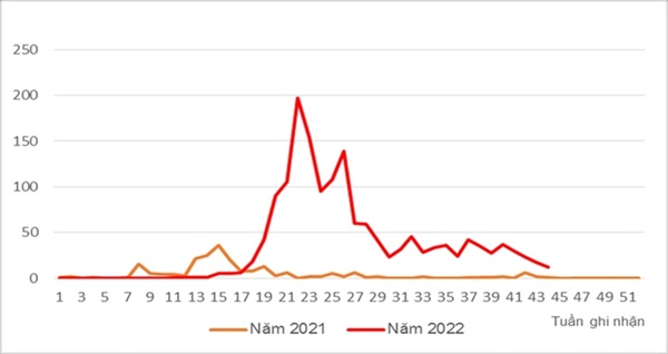 Phân bố số ca mắc tay chân miệng theo tuần năm 2021, 2022.