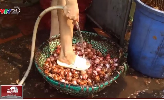 Hành đã thối rữa được xử lý trước, dùng chân giẫm lên để rửa, nhằm làm bong tróc lớp vỏ thối ra khỏi củ hành.