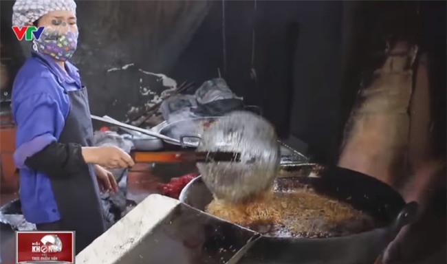 Sau khi trộn bột, hành tây, hành tàu, khoai tây được đổ vào chảo. Dầu mỡ tái chế đen đặc được dùng nhiều lần để chiên các nguyên liệu, thả vào chảo dầu sôi khoảng 5 phút thì hành chín sẽ nổi lên trên.