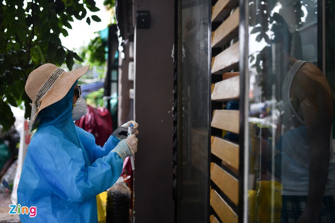 Nhân viên y tế hướng dẫn người dân tự xét nghiệm nhanh tại nhà. Ảnh: Phạm Ngôn.