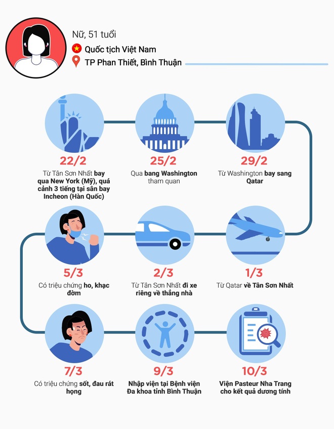 Ngày 10/3, Bình Thuận ghi nhận ca mắc đầu tiên là nữ bệnh nhân 51 tuổi. Đây là người phụ nữ trở về từ Mỹ, nhập cảnh Việt Nam tại sân bay Tân Sơn Nhất. Sau đó, tỉnh này tiếp tục có 3 người bị lây nhiễm virus corona từ nữ bệnh nhân này là con dâu, tài xế và nhân viên của bà. Như vậy, với 5 ca mới, Bình Thuận đã có 9 người mắc Covid-19.