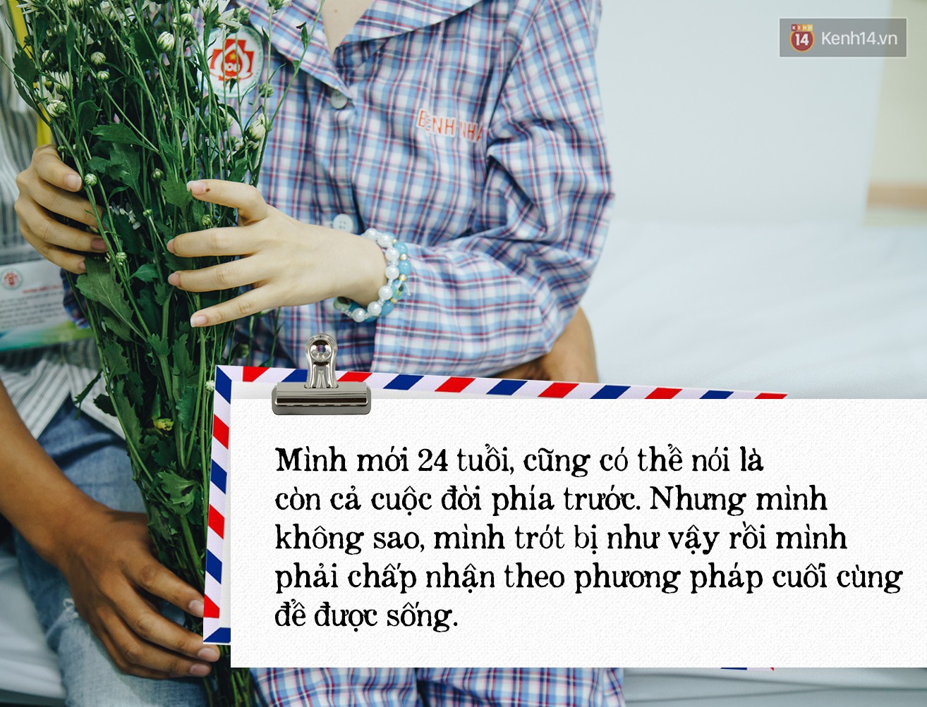 "Mình mới 24 tuổi, cũng có thể nói là còn cả cuộc đời phía trước. Nhưng mình không sao, mình trót bị như vậy rồi mình phải chấp nhận theo phương pháp cuối cùng để được sống. Còn nếu không được, mình vẫn cứ đẹp đến lúc mình còn đẹp được. Cứ ngồi đấy lo lắng, buồn phiền cũng không giải quyết được vấn đề gì".