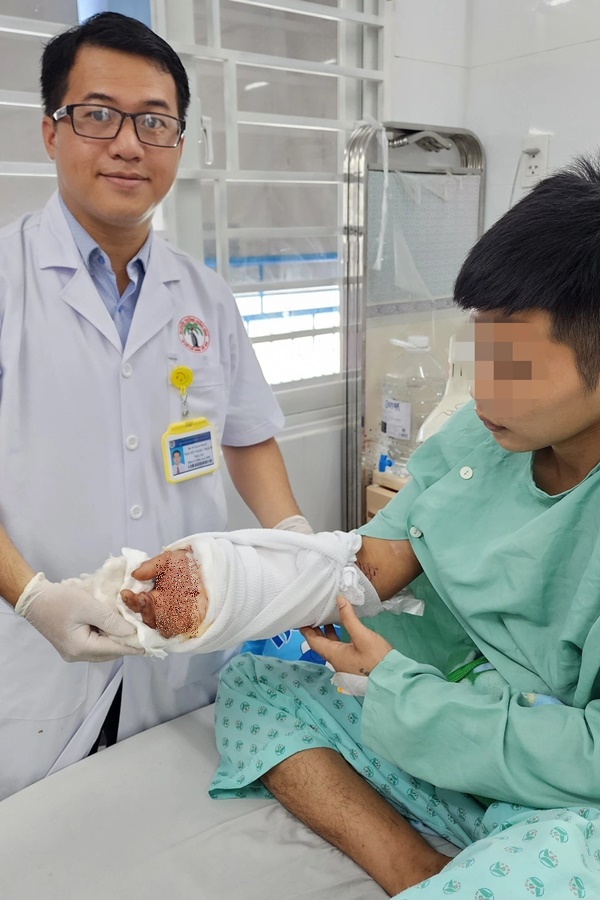 Bệnh nhân được các đồng nghiệp sơ cứu tại chỗ rồi mang theo phần bàn tay bị đứt lìa, đi thẳng đến Bệnh viện Chấn thương Chỉnh hình TPHCM lúc 0h.