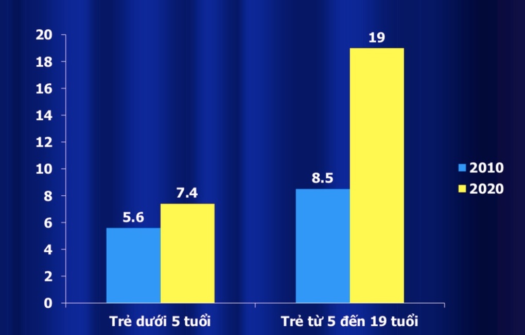 Tại Việt Nam, sau 10 năm tỷ lệ thừa cân béo phì ở trẻ dưới 5 tuổi tăng 1,5 lần (từ 5,6% vào năm 2010 lên 7,4% vào năm 2020). Con số này ở trẻ 5-19 tuổi cũng tăng gấp đôi (từ 8,5% lên 19%). Đặc biệt, tại TPHCM cứ 2 trẻ sẽ có 1 trẻ bị thừa cân, béo phì.