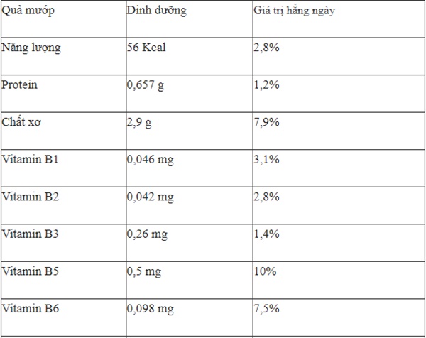Trong quả mướp có chứa nhiều nước, protid, lipid, glucid, xenlulo, canxi, photpho, sắt, beta-caroten, B1, B6, B2, C…