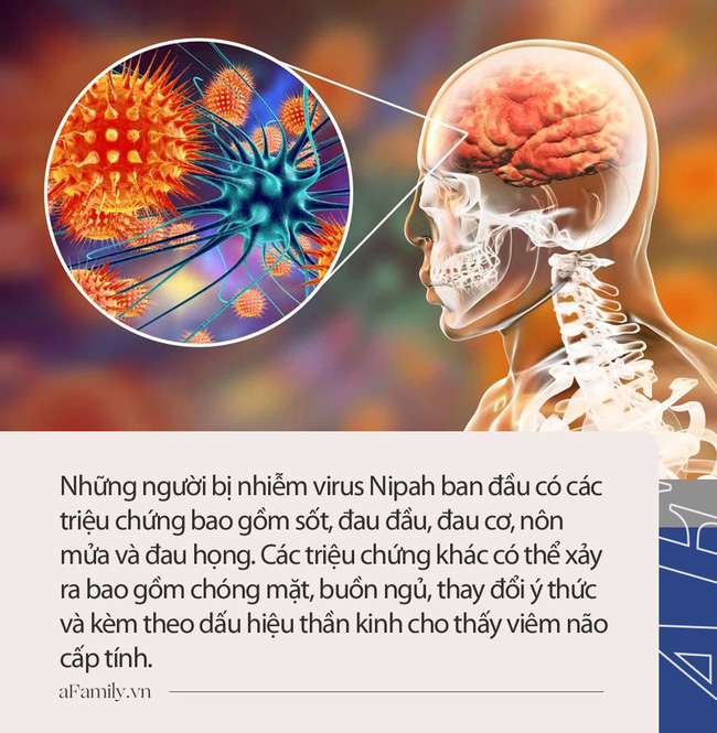 Những người bị nhiễm virus Nipah ban đầu có các triệu chứng bao gồm sốt, đau đầu, đau cơ, nôn mửa và đau họng. Các triệu chứng khác có thể xảy ra bao gồm chóng mặt, buồn ngủ, thay đổi ý thức và kèm theo dấu hiệu thần kinh cho thấy viêm não cấp tính.