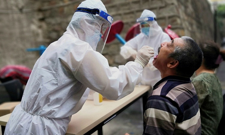 Nhân viên y tế lấy mẫu xét nghiệm nCoV cho một người dân ở Tân Cương, Trung Quốc hồi tháng 7/2020. Ảnh: Reuters.