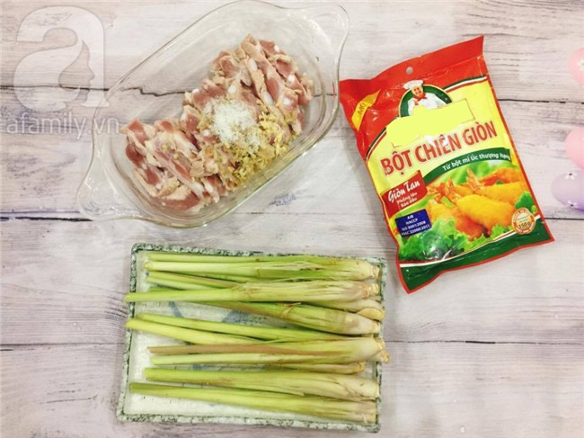 Kẹp từng miếng sụn vào cây sả theo chiều dọc, khéo léo đan xen các cọng sả để cố định miếng sụn.