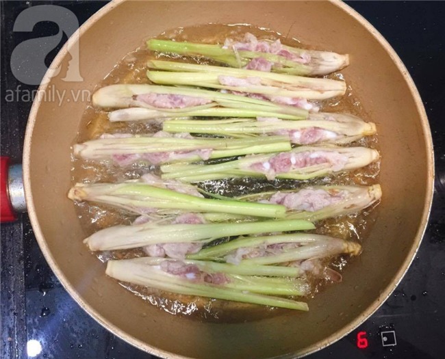 Cho từng cây sả kẹp sườn vào chảo ngập dầu, trở đều, chiên vàng.
