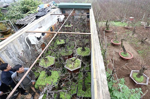 Khu vườn chỉ rộng chừng 300m2 nhưng có tới 3 “lô cốt” quây tôn kín mít, lắp điều hòa cỡ lớn. Bên trong “lô cốt” xếp chật ních những chậu đào Thất Thốn, hình dáng như cành củi khô, lác đác nở hoa đỏ thẫm.