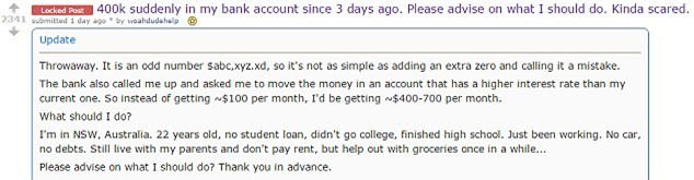 Anh chàng người Úc này đột nhiên có số dư tài khoản ngân hàng tăng thêm 400 nghìn đô (khoảng 9 tỉ VND) cách đây vài ngày trước. Ngay sau đó, anh nhanh chóng cầu cứu cư dân mạng để cho lời khuyên.