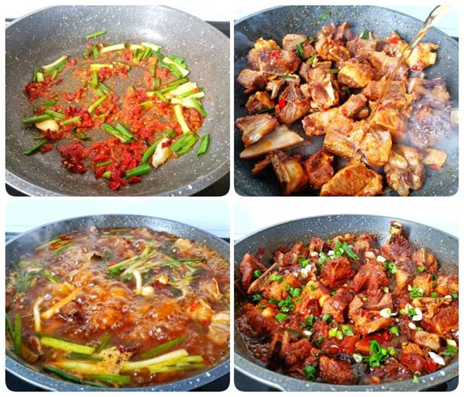 - Sau đó cho sườn bò đã chiên vào, đảo đều cho sườn bò được thơm.