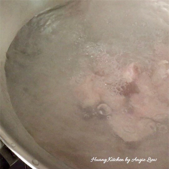 Sườn rửa sạch để ráo. Đặt một nồi nước lên bếp đun sôi thì thả sườn vào trần, để 2 phút rồi đổ ra rổ, rửa lại lần nữa.