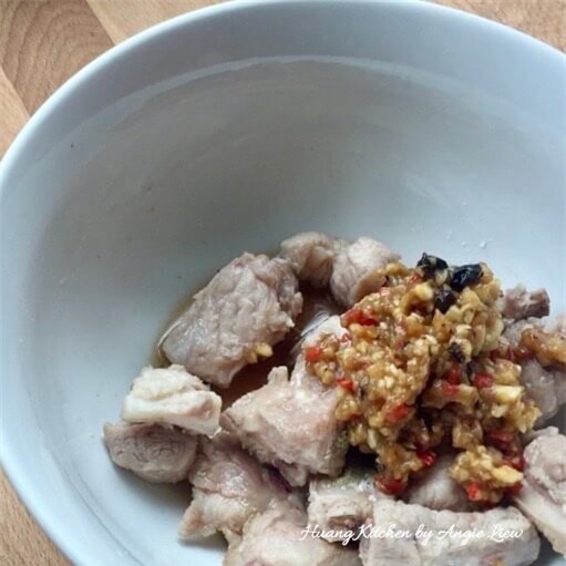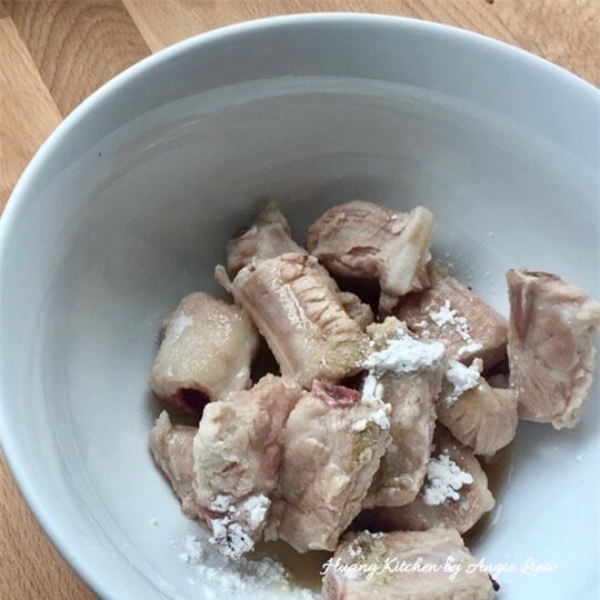 Cho sườn vào bát tô sau đó cho hết phần gia vị ướp sườn vào trộn đều lên.