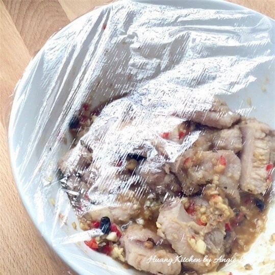 Dùng màng bọc thực phẩm phin kín tô lại, ướp sườn ít nhất 30 phút.
