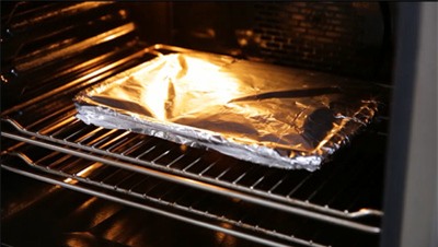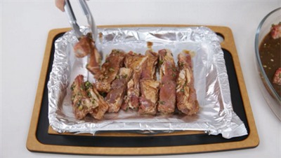 ![]() | Sau khi nướng bạn gỡ bỏ giấy bạc ra và cho khay sườn vào nướng thêm 15 phút nữa là được. |