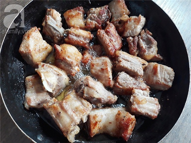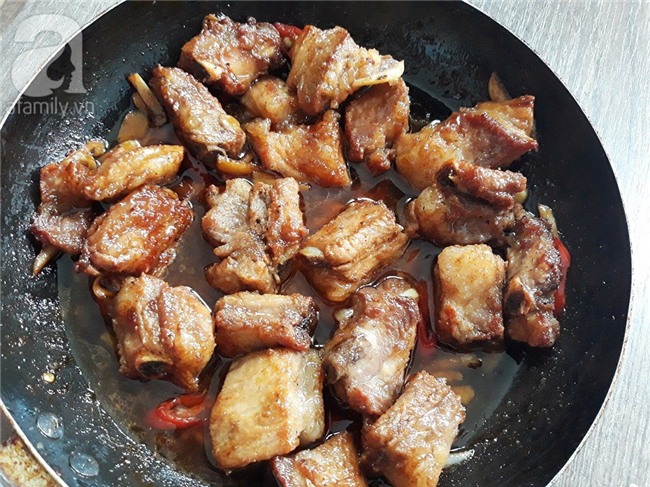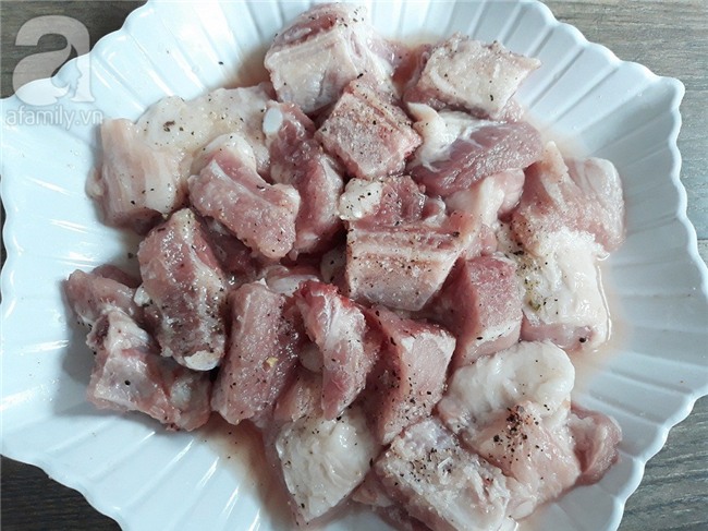 Sườn rửa sạch, chặt miếng vừa ăn rồi ướp với gia vị để tầm 15 phút cho ngấm.
