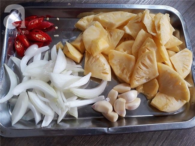 Các loại củ quả rửa sạch, dứa thái miếng mỏng vừa ăn, ớt cắt lát, hành tây thái mỏng, tỏi bóc vỏ.