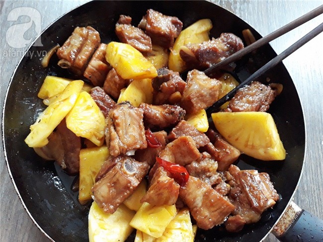 Tiếp đến thêm phần dứa đã thái vào chảo, tiếp tục đảo đều.
