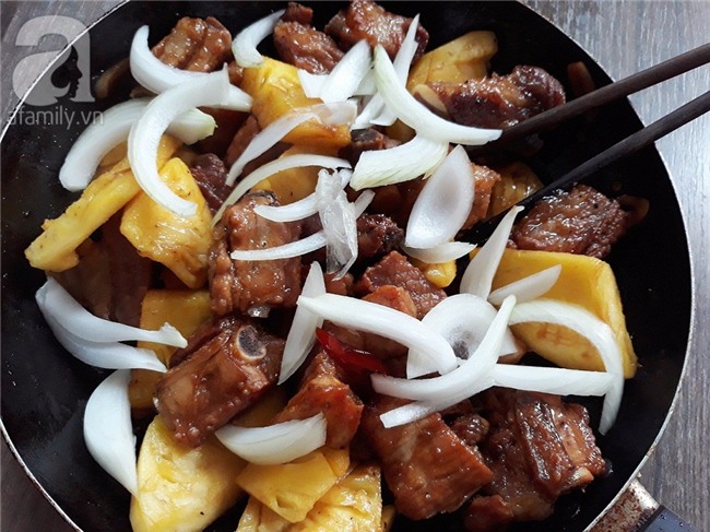 Khi thấy chảo sườn sốt dứa đã thơm, nước sánh gần cạn thì nêm nếm lại gia vị và cho hành tây vào đảo đều là được.
