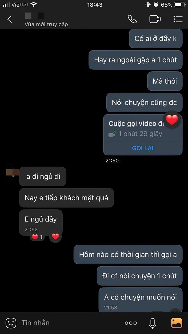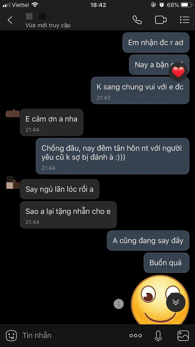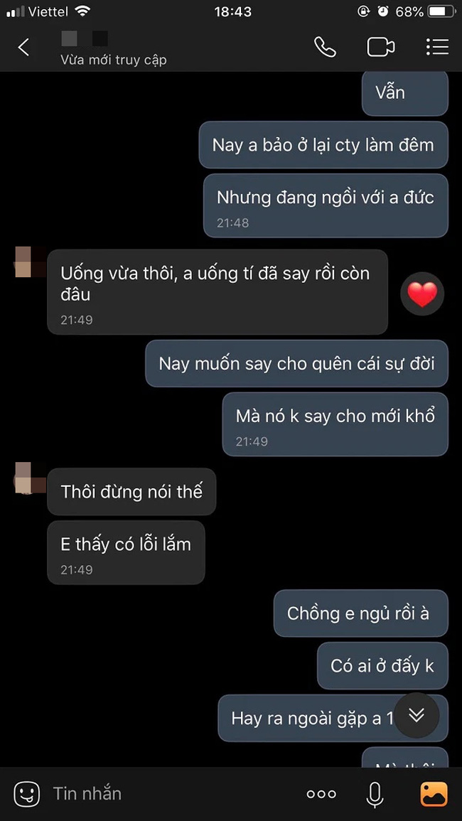 Mấy ngày nay, chồng tôi luôn viện cớ bận rộn để ở lại công ty. Sáng sớm, anh sẽ về thay quần áo rồi lại đi tiếp. Mỗi lần như vậy, tôi đều ngửi thấy mùi rượu trên người chồng, hỏi thì anh nói công việc phải tiếp khách nên không tránh được. Cho đến tối nay, nhân lúc chồng đi tắm, tôi mở điện thoại anh để xem công việc có gì áp lực không. Cuối cùng lại đọc được những dòng tin nhắn đau lòng trên. Thú thật, tôi đang rất rối trí. Sống cùng nhau mấy năm, vậy mà anh lại nói không có tình cảm với vợ. Trong khi đó, tôi yêu chồng và hết lòng với gia đình. Tôi nên nói chuyện thẳng thắn với anh hay giả vờ không biết rồi vun đắp để tình cảm vợ chồng có thể khá hơn đây?