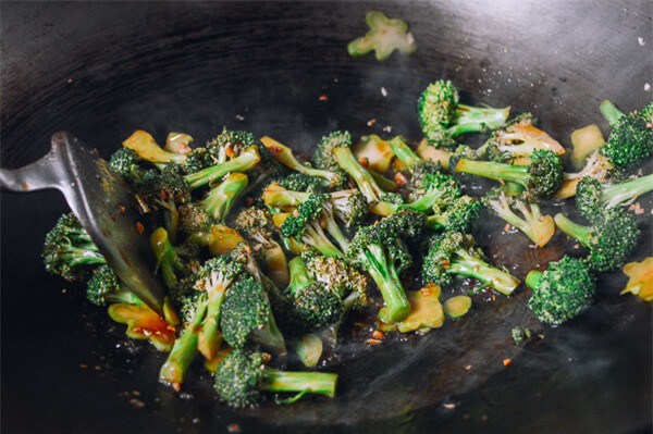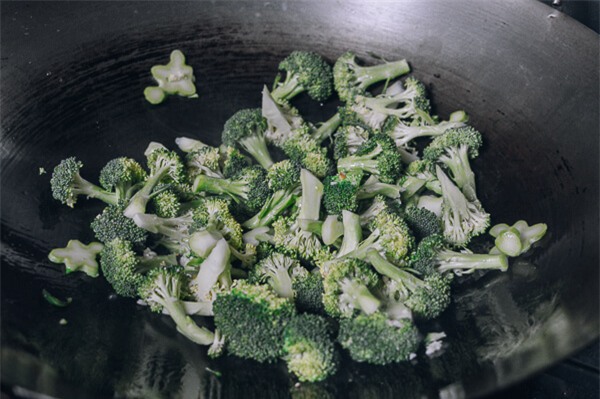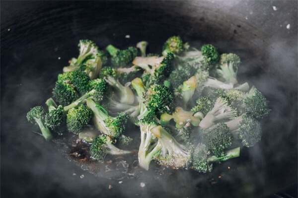 Đun nóng chảo với lửa lớn, thêm dầu thực vật, tỏi, súp lơ và tiến hành xào nhanh để tỏi không bị cháy.