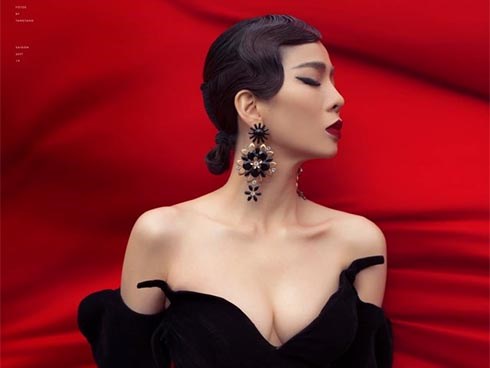 Nữ ca sĩ khoe dáng tại sự kiện Elle Fashion Journey 2016 trong bộ suit ren đen gợi cảm.