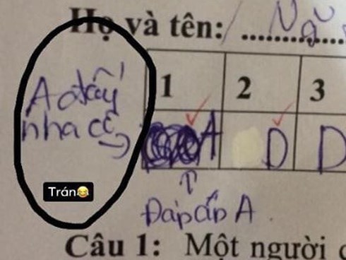Vì gạch xóa nhiều quá trong bài kiểm tra nên hết chỗ, nam sinh đã phải ghi thêm 2 câu "A đấy nha cô", "Đáp án A" khiến ai nấy phì cười.