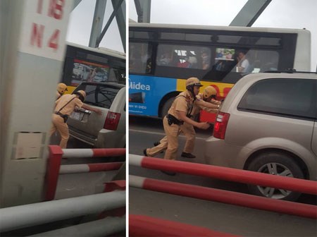Hai chiến sĩ CSGT gồng mình đẩy xe, hình ảnh khiến cả dòng người mỉm cười