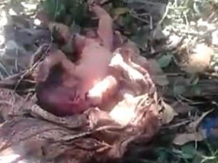 Khi lại gần, người dân thấy khuỷu tay và chân bé sơ sinh trồi khỏi lớp đất. Sau đó vội cào lớp đất thì phát hiện một đứa bé còn nguyên dây rốn rất đáng thương.
