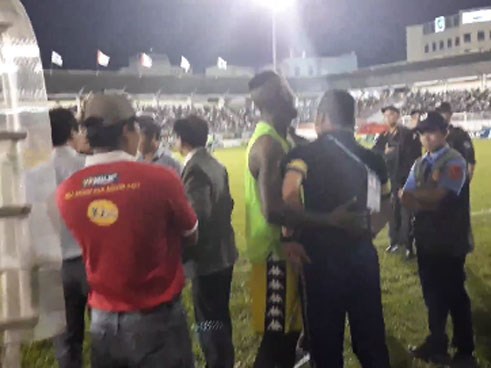 HLV Chu Đình Nghiêm bị một CĐV lạ mặt tiếp cận trong đường hầm sân Pleiku sau khi bị trọng tài chính Ngô Duy Lân...