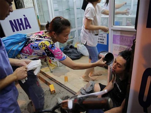 Hình ảnh chiến sĩ PCCC ngạt khói ngồi gục bên cửa hàng được người phụ nữ tiếp nước sơ cứu tại đám cháy nhà máy phích nước Rạng Đông.....