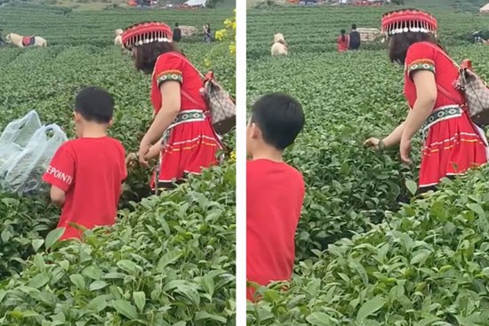 Cộng đồng mạng truy tìm danh tính người phụ nữ vô ý thức thẳng tay vặt sạch ngọn chè trên đồi chè mang về