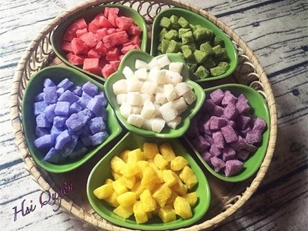 Những lọ mứt dừa hình hạt lựu có màu sắc "thập cẩm": đỏ, xanh, tím, vàng... vừa gây sốt cộng đồng mạng trong những ngày cận Tết Nguyên Đán.
