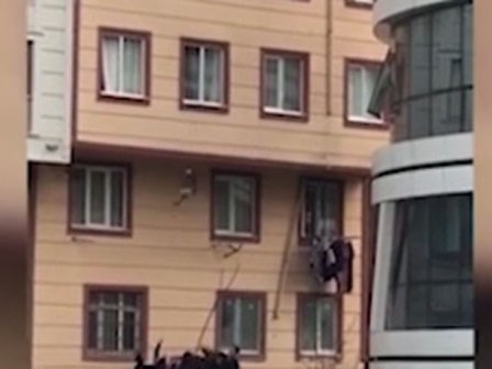 Đoạn video được một người quay lại tại quận Kagithane, thành phố Istanbul, Thổ Nhĩ Kỳ. Cậu bé 3 tuổi cố bám víu ở lan can tầng hai và bên dưới là “đội cứu hỏa” chờ sẵn.