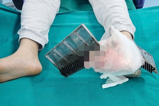 Bước lên bậc thang, chân bé trai 12 tuổi bất ngờ bị kẹp vào thang cuốn. Em được đưa vào bệnh viện cùng 2 tấm sắt thang cuốn cắm sâu vào chân