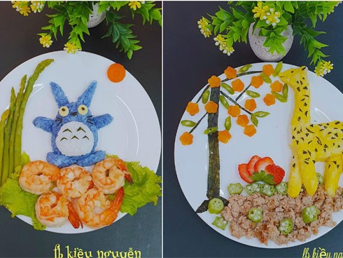 Những đĩa cơm được chị Kiều chuẩn bị cho con vô cùng sáng tạo trong cách trang trí và tạo hình, khiến con gái tự ngồi vào ghế chờ đợi bữa ăn một cách đầy hào hứng.