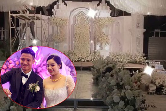 Cận cảnh chiếc váy cưới lấp lánh của vợ Bùi Tiến Dũng mặc trong hôn lễ ở Hà Nội, thêm 2 khu sân khấu cả ngoài trời - trong nhà cũng đều rất hoành tráng