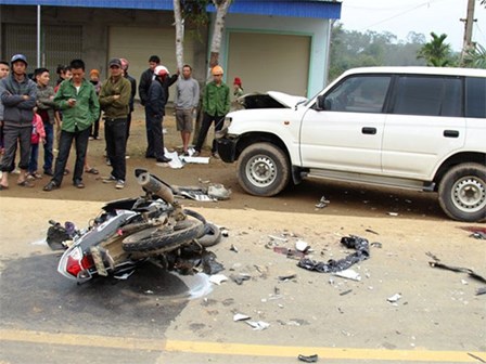 Xe máy lưu thông trên quốc lộ 15A đoạn qua Hà Tĩnh tông trực diện ôtô biển xanh khiến 3 nam thanh niên tử vong.