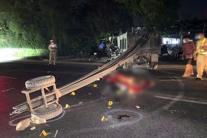 Hậu quả vụ tai nạn giao thông làm người điều khiển xe máy và tài xế xe container tử vong tại chỗ.