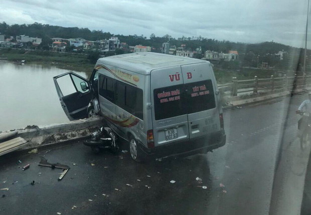 Tiếp đó ô tô khách khách 16 chỗ biển số 63B – 007.93 chạy từ Bắc vào Nam (chưa rõ người điều khiển) va vào xe tải, rồi tông vào thành cầu Trà Khúc 2. Rất may xe khách bị vướng lại, suýt rơi xuống sông.