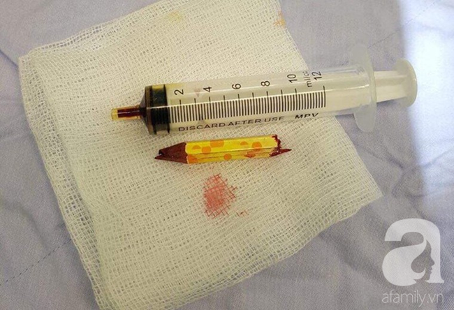 Ngòi bút chì dính đầy máu sau khi lấy ra.