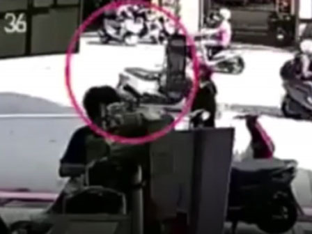 Trong clip có thể thấy, người cha để 2 con ngồi trên chiếc xe ga vẫn còn nổ máy, để đứng nói chuyện với một người phụ nữ. Một trong hai đứa con vô tình chạm vào tay ga khiến chiếc xe chạy vọt đi.