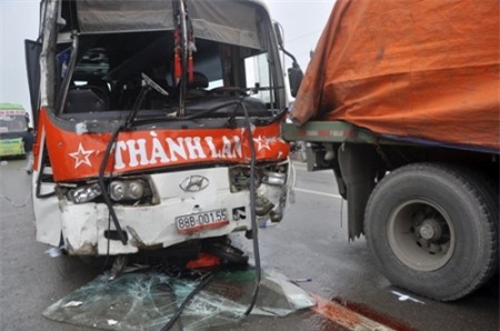 Sau khi kéo lê xe đạp điện, chiếc xe khách này tiếp tục đâm vào một xe khách khác và một xe máy chở nước đang đi cùng chiều. Chiếc xe khách chỉ dừng lại khi đâm vào đuôi xe container.