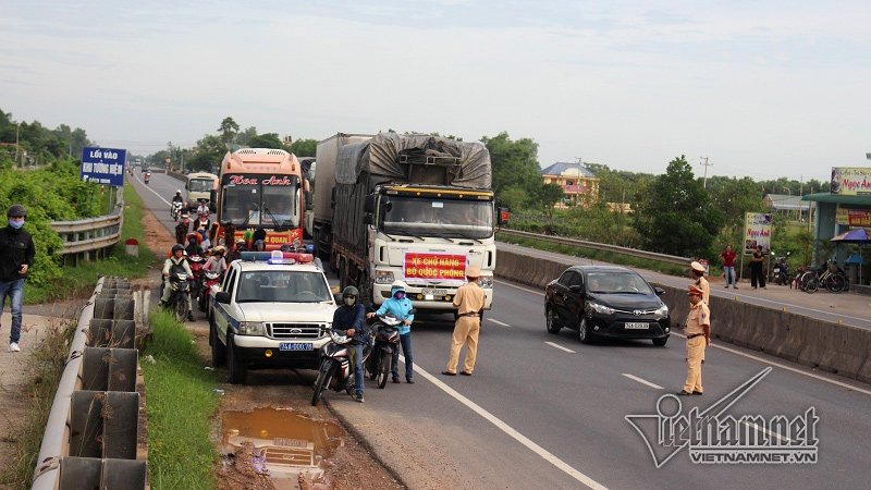 Từ sáng sớm, lực lượng CSGT đã có mặt để yêu cầu các phương tiện cơ giới trên QL1A tạm dừng để nhường đường cho xe tang