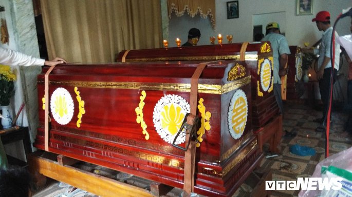 Ba cỗ quan tài của chú rể Lê Khắc Long, bà Ngô Thị Bê và cháu Nguyễn Thư Kỳ đặt song song trong ngôi nhà chật hẹp.