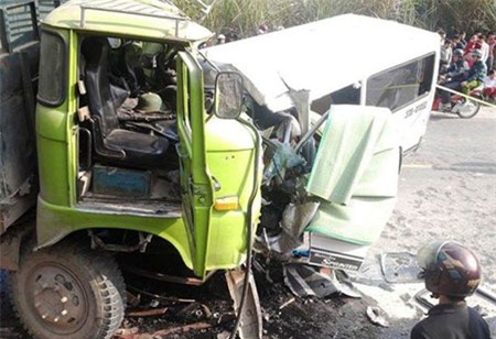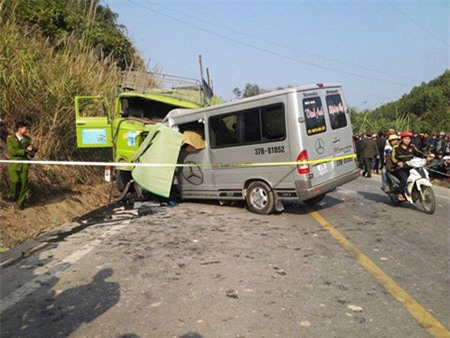 Theo thông tin ban đầu từ một số người dân sống bên đường, cả 2 chiếc xe chạy với tốc độ rất nhanh, sau đó chiếc xe 16 chỗ nổ lốp mất lái đã tông thẳng vào chiếc xe tải.